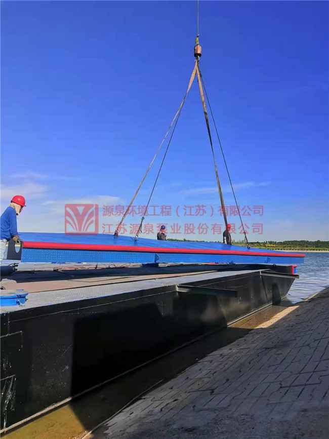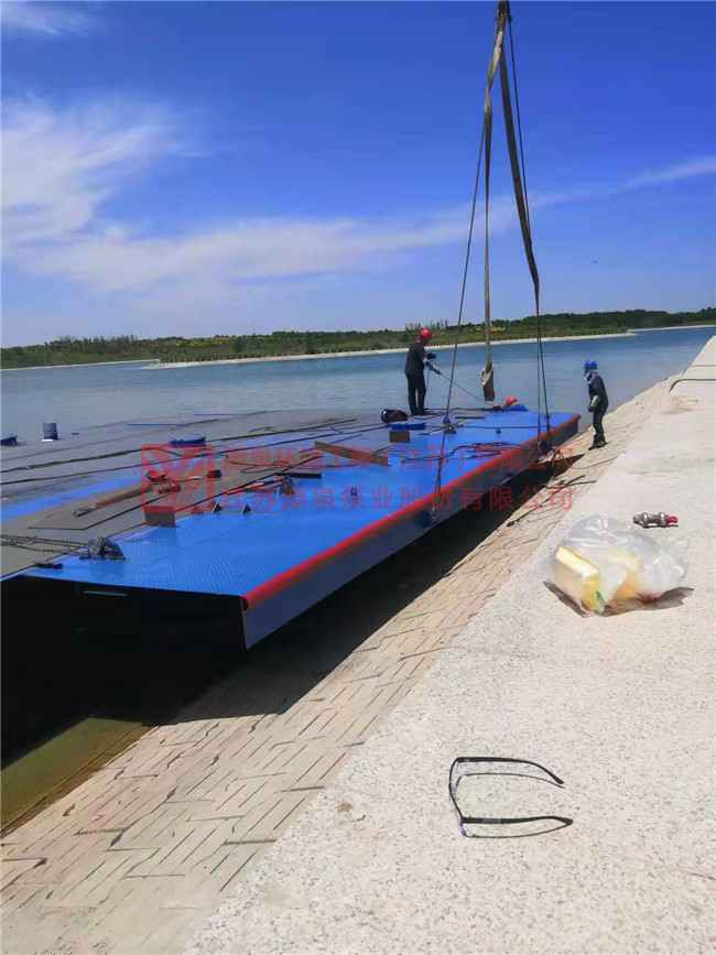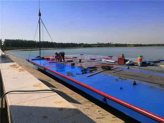 茌平县东邢水厂项目取水浮船泵站正在安装中。